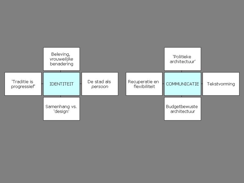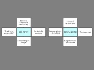 Uiteindelijk kan het zelfs in een schema samengevat worden, rond de polen‘Stedelijke identiteit’ en ‘Communicatie’; twee spillen met elk vier ‘spaken’. ‘Stedelijke identiteit’ is de rode draad in onze zoektocht naar de Stad. ‘Communicatie’ is essentieel om een zo breed mogelijk sociaal draagvlak te creëren. Vooral de publieke ruimte staat centraal. De filosofie waarop die ontwerpvisie teruggaat, hebben wij uitgebreid neergeschreven in ons boek ‘Passione Urbana’ (Roularta Books, 2006). Ons boek ‘Architettura Povera’ (Roularta Books, 2007) bouwt daarop verder en legt ook een link naar de vreemde houding van de overheid omtrent architectuurwedstrijden.
