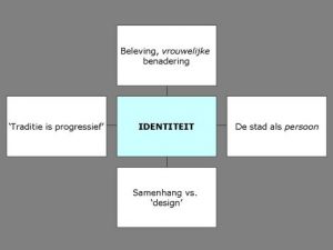 Naast de grootstedelijke agglomeraties zijn er in Vlaanderen zo’n 30 ‘centrumsteden’ van om en bij de 100.000 inwoners, met een eigen karakter en historisch gegroeid weefsel. Zelfs met je ogen dicht ‘ruik’ je bijna waar je bent, zo sterk is hun eigen spontaan profiel. Toch wil iedere stad dezelfde dingen als wat de andere willen (vooral veel winkelen). Ondanks het feit dat het fameuze ‘publiek draagvlak’ steeds meer over identiteitsgevoel, herinnering en specificiteit, blijkt te gaan, is elke stad volop bezig met marketing (‘de stad op de kaart zetten’). Terwijl het om de echte kernvragen zou moeten gaan. Wie zijn we? Wat onderscheid ons van andere steden en regio’s? Waar willen we naar toe met onze stad, onze wijk? De zoektocht naar die stedelijke identiteit, noem het maar een soort psycho-analyse, is voor ons essentieel. Het ontdekken van die identiteit is evenzeer een zaak van aanvoelen en observatie, als van wetenschappelijke en historische research. Ons ontwerpwerk begint aan de studietafel, in de bibliotheek, de archieven, op de plek zelf. Welke mensen wonen, leven of passeren hier? Wat is de sfeer? Wat betekent deze plek, historisch en vandaag? De waarheid van deze plek is niet die van een andere plek. Gebouwen, straten, pleinen, buurten vibreren op een ritme, een biologische klok, en bezitten een kwaliteit die onvervreemdbaar is. Elk gebouw, plein, wijk, … gonst van verhalen en emoties. Heeft een eigen identiteit.